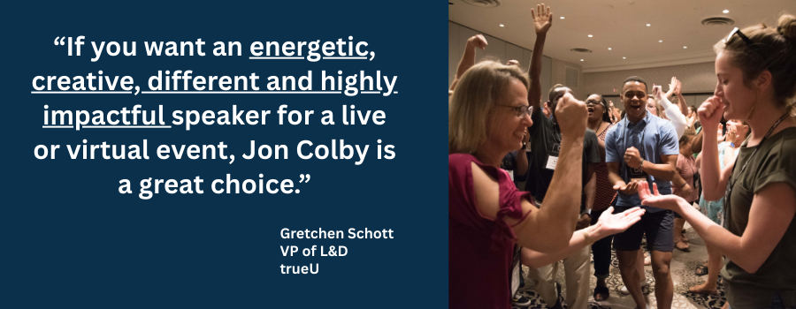 ”Jon Colby has presented to two different audiences for my company and both times he received RAVE reviews. The presentations were grounded in sound business principles and strategies while maintaining an energy-infused, awesome level of engagement and interactivity...We wouldn’t hesitate to book him again.”